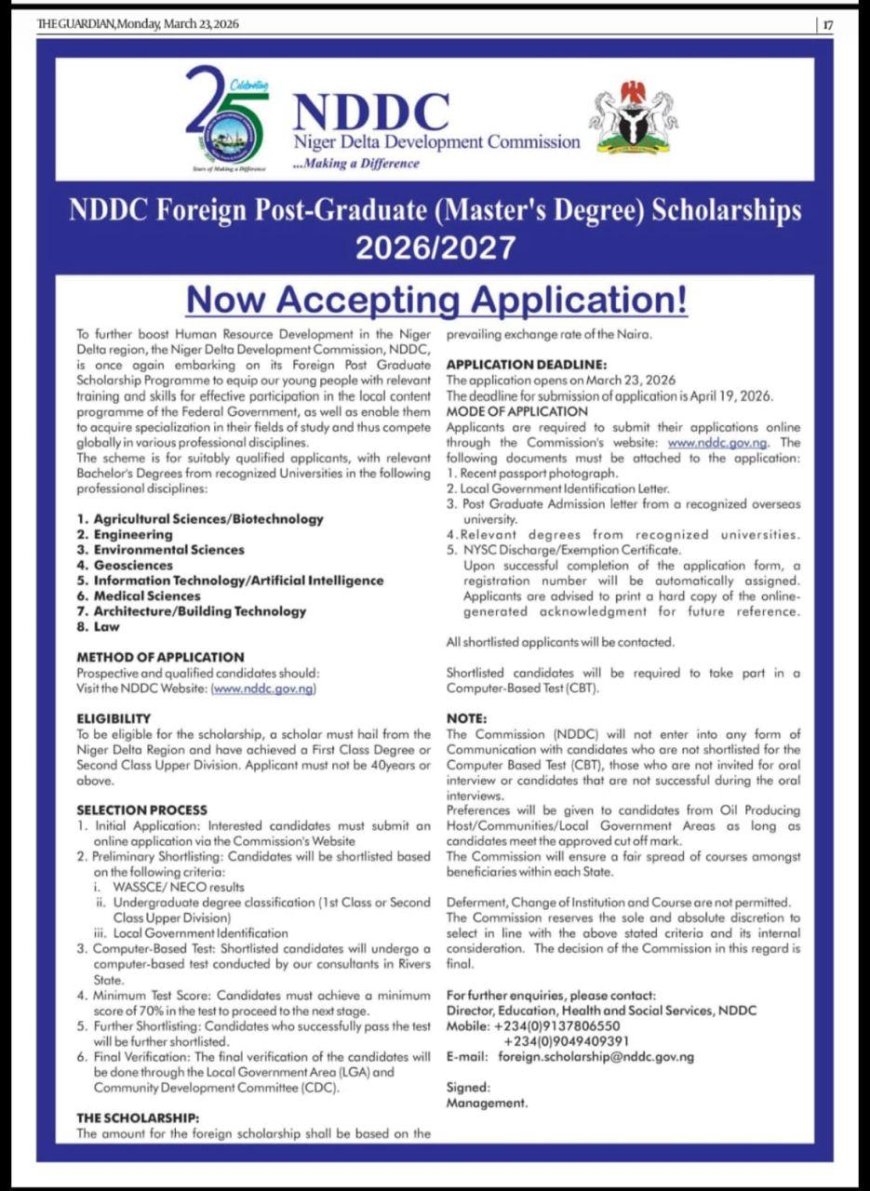 Cross River State representative on the NDDC board, Rt. Hon. Orok Duke, has called on qualified state indigenes, especially first‑class and upper‑second graduates under 40 years, to apply for the Commission's 2026/27 Foreign Post‑Graduate Scholarship.